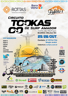CIRCUITO TOOKAS DE SURF AMADOR 2ª ETAPA 25 E 26 O U T U B R O BARRA VELHA - SC EVENTO : CONCLUÍDO CLIQUE NO CARTAZ AO LADO PARA ACESSAR AS BATERIAS |