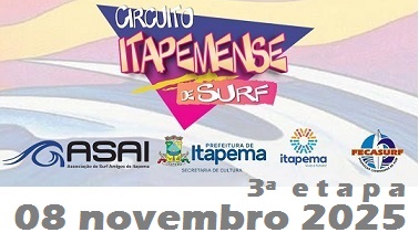 CIRCUITO ITAPEMENSE DE SURF ASAI 2ª ETAPA DOMINGO DIA 28 S E T E M B R O EVENTO CONCLUÍDO CLIQUE NO CARTAZ AO LADO PARA ACESSAR AS BATERIAS |